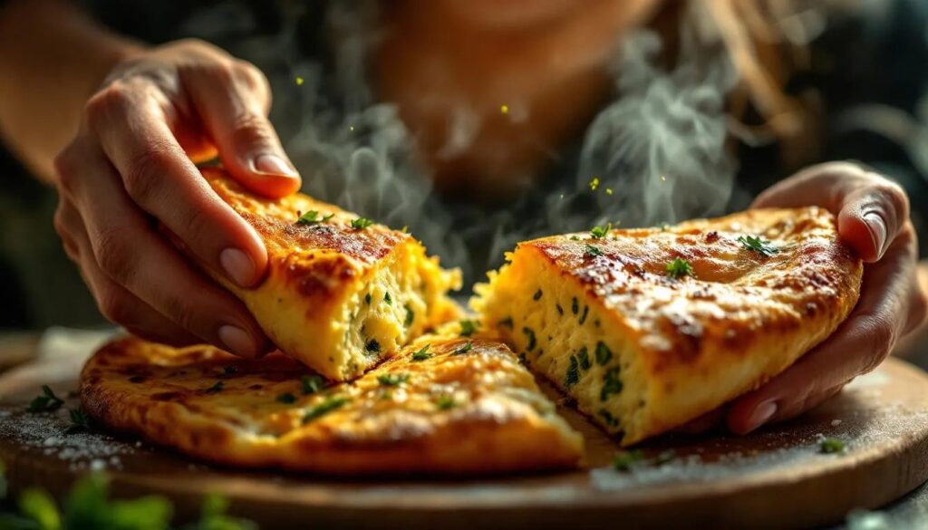 Die Pfanne auf mittlere bis hohe Hitze stellen und einen dünnen Film Olivenöl hineingeben. Wenn das Öl leicht schimmert – nicht raucht –, den ersten Fladen einlegen. Jetzt nicht bewegen. Nach etwa 90 Sekunden bilden sich an der Unterseite goldbraune bis leicht dunkelbraune Röstflecken, die Oberfläche beginnt matt zu werden und es zeigen sich kleine Bläschen. Das ist der Moment zum Wenden. Mit einem Pfannenwender oder mutig per Handgelenk-Schwung den Fladen umdrehen. Weitere 60–90 Sekunden auf der zweiten Seite garen, bis auch diese Seite schöne Flecken zeigt. Der fertige Fladen klingt beim Klopfen auf die Unterseite leicht hohl – ein sicheres Zeichen, dass die Mitte durchgegart ist. Mit den restlichen Teigstücken wiederholen und die fertigen Fladen in ein sauberes Geschirrtuch einschlagen, damit sie warm und weich bleiben.