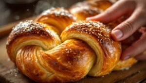 Den Teig in vier gleich große Stücke teilen. Jedes Stück auf einer leicht bemehlten Arbeitsfläche mit dem Nudelholz oder den Handflächen zu einem runden Fladen von etwa 15 cm Durchmesser und 4–5 mm Dicke flachdrücken. Gleichmäßige Dicke ist der Schlüssel: Zu dicke Stellen bleiben innen teigig, zu dünne werden papierig. Wer mag, drückt mit den Fingerspitzen kleine Mulden in die Oberfläche – dort sammelt sich später die Butter und bildet kleine Aromapools.